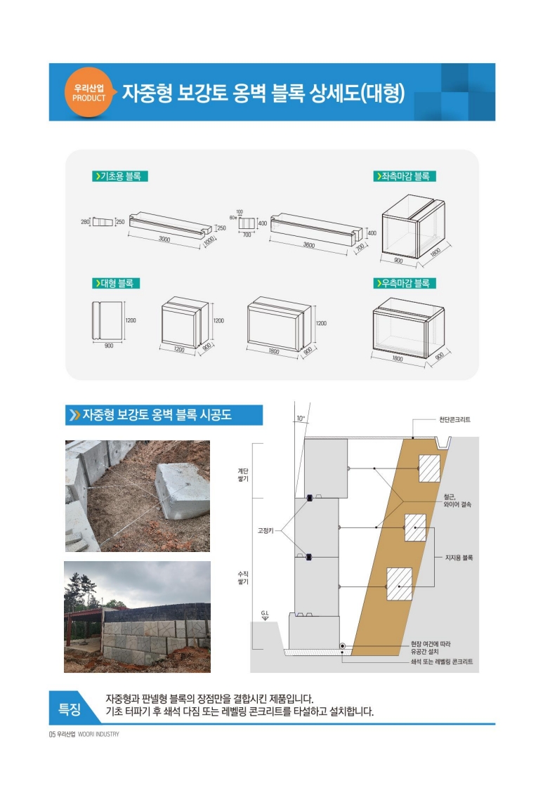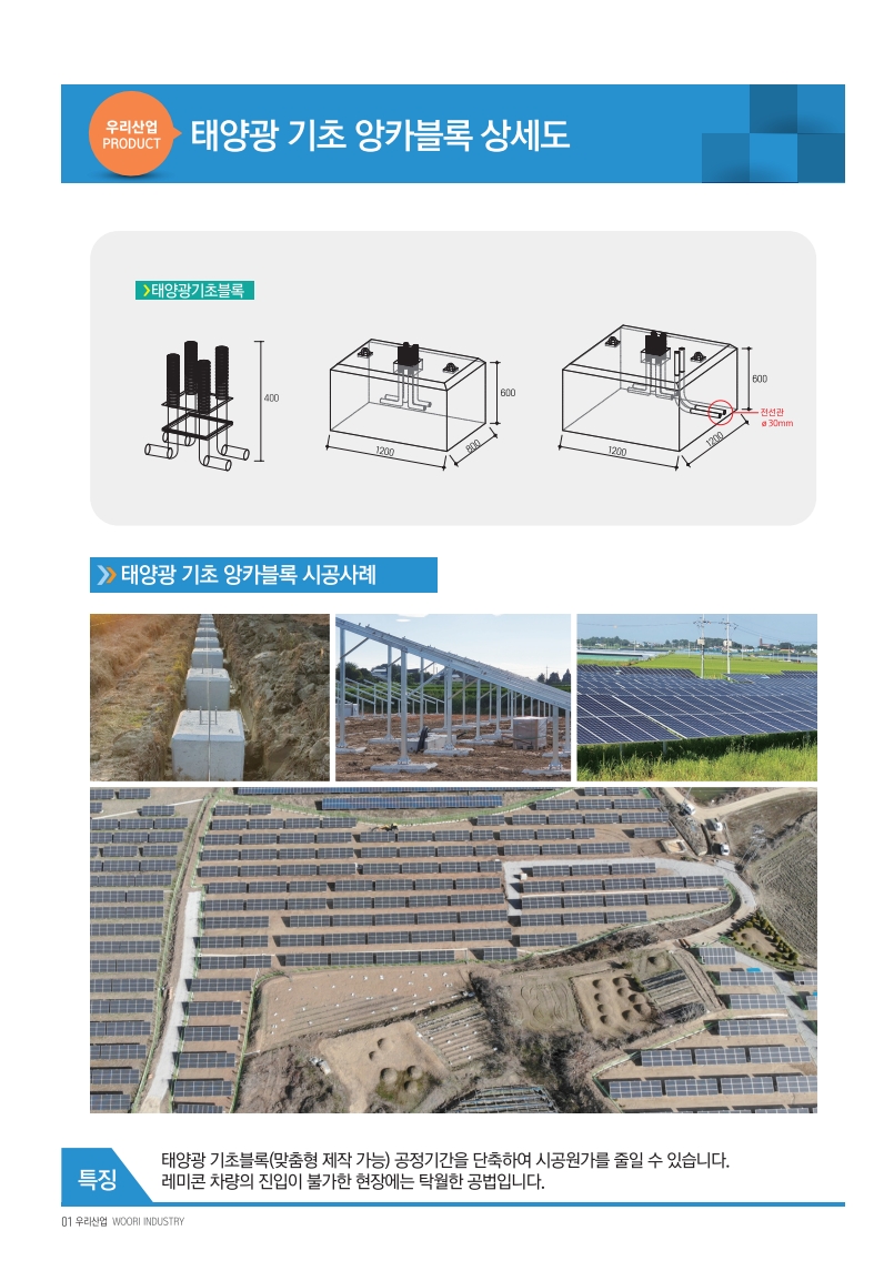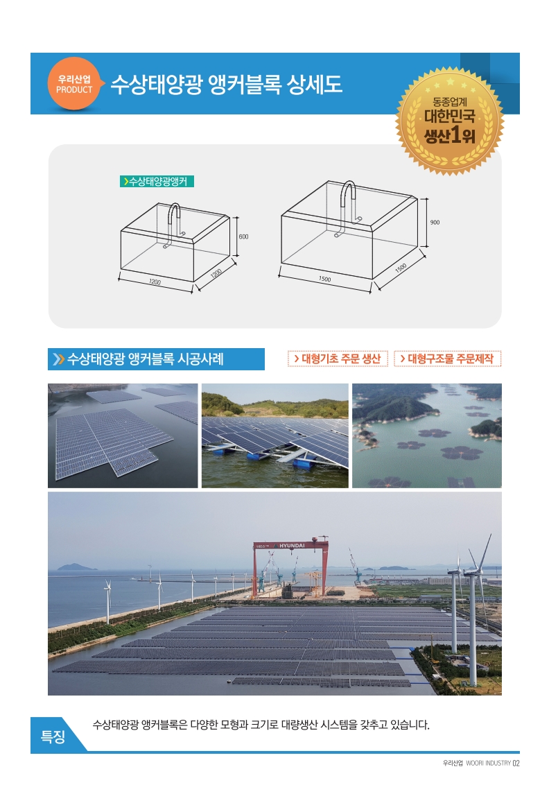 우리산업은 수상,육상태양광 기초앵커블록 주문제작, 영농형 태양광 설치 자격증 보유, 자중형콘크리트블록 제작시공 및 각종 석공사 시공전문업체입니다.